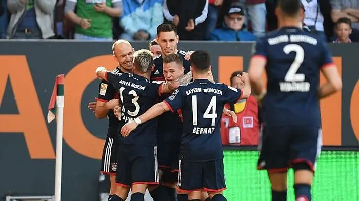 Bayern München hat durch die 28. deutsche Fußball-Meisterschaft den ersten großen Titel der Saison gefeiert. Die Triplejäger krönten sich am Samstag mit dem 4:1 (2:1) bei Augsburg zum sechsten Mal in Folge zum Bundesliga-Champion. Für ÖFB-Star David Alaba, der mit Rückenproblemen fehlte, ist es der siebente Titel mit den Bayern, für Trainer Jupp Heynckes auf seiner Abschiedstournee der vierte.