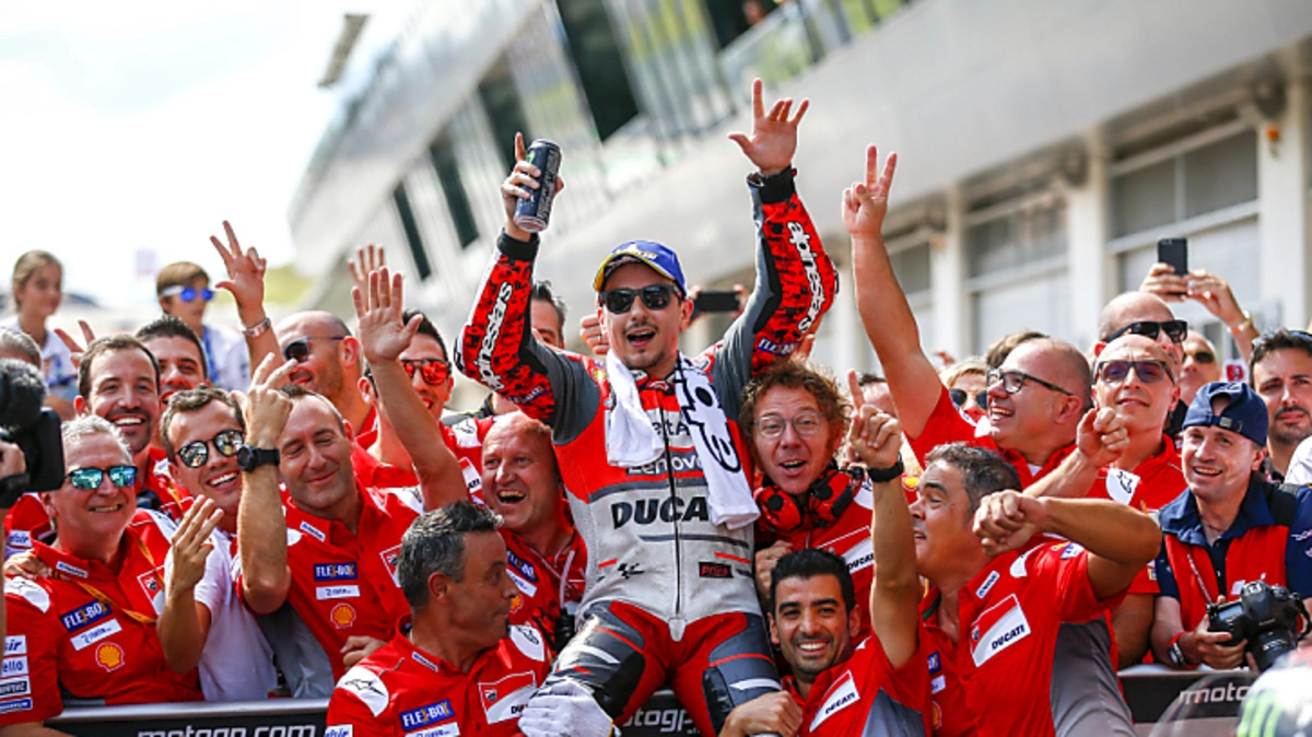 Spielberg bleibt Ducati-Land. Nach Andrea Iannone 2016 und Andrea Dovizioso 2017 sorgte am Sonntag Jorge Lorenzo auf dem Red Bull Ring für den dritten Triumph der "Desmosedicis" in Folge. Der Spanier setzte sich nach einem packenden Zweikampf vor Weltmeister Marc Marquez auf der Honda durch. Marquez baute seine WM-Führung dennoch aus, er liegt nach elf Rennen schon 59 Punkte vor Valentino Rossi.