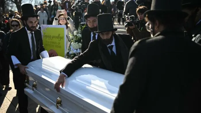 Trauerfeier für den "Penny": In Washington ist am Samstag die Ein-Cent-Münze symbolisch zu Grabe getragen worden. Am berühmten Lincoln Memorial warfen in historische Kostüme gekleidete "Trauergäste" Ein-Cent-Münzen in einen weißen Sarg. Unter den Teilnehmenden war ein Paar, das sich als Abraham und Mary Todd Lincoln verkleidet hatte.