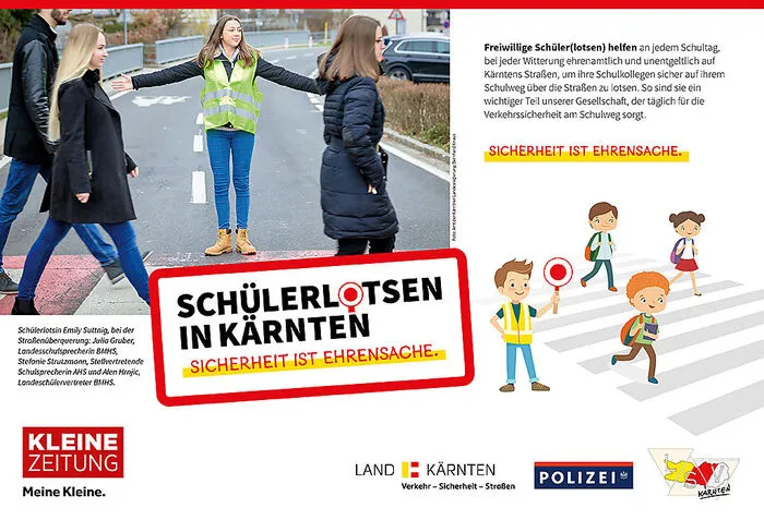 Mach mit! Jährlich erhalten in Kärnten ca. 300 Schüler durch polizeilich geschulte Schülerlotsenausbildner eine Schulung zum Schülerlotsen. Trotz der Vielzahl an ehrenamtlichen Helfern, gibt es immer noch Straßenübergänge, die zur Gefahr werden können. Die Kampagne „Schülerlotsen in Kärnten. Sicherheit ist Ehrensache“ soll die Sicherheit am Schulweg weiter vorantreiben.