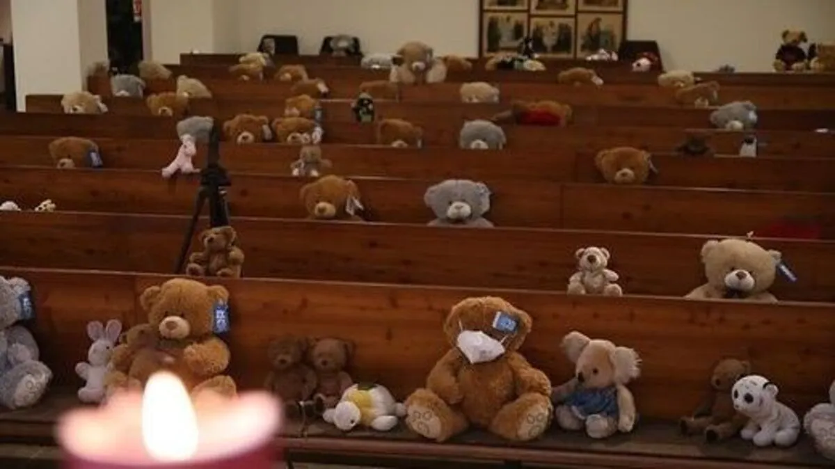 In einer Kirche in Wien messen Teddy-Bären den richtigen Abstand