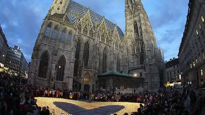 Die Caritas und die ukrainische Gemeinde setzten ein Zeichen zur weiteren Unterstützung für die Ukraine. 5.000 Kerzen leuchteten in Form eines Herzens.
