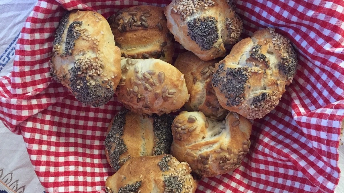 - Auf ein mit Backpapier belegtes Blech setzen, mit Wasser bestreichen und mit Sesam, Blaumohn oder Kümmel bestreuen.