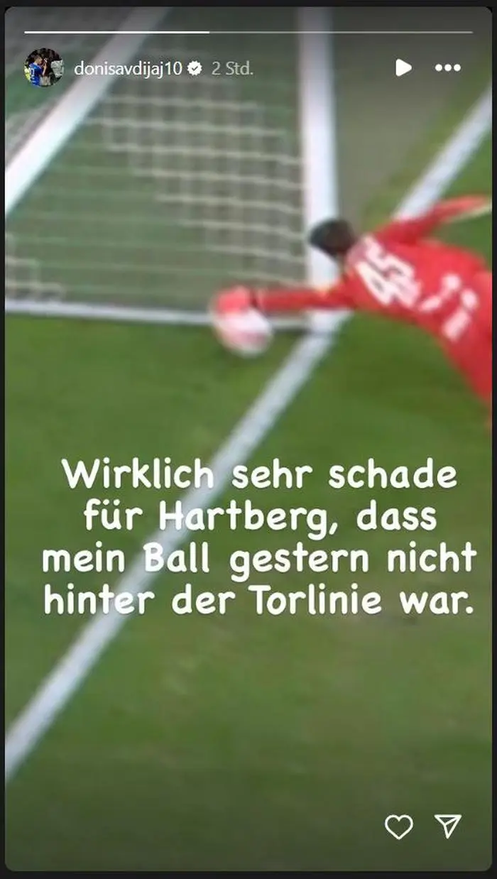 Es war eine der entscheidenden Situationen in der Begegnung zwischen Rapid und Hartberg. Nach einem geklärten Eckball kommt der Ball über Umwege zu Donis Avdijaj, der Hartberg-Offensivspieler köpfelt und Rapid-Torhüter Niklas Hedl klärt den Ball. Ohne Torlinientechnologie ein Ding der Unmöglichkeit zu beurteilen, ob der Ball mit vollem Umfang hinter der Linie war oder nicht. Avdijaj ist sich jedenfalls „zu 100 Prozent sicher“, dass es sich um ein reguläres Tor gehandelt hat - und erklärt das auch am Tag nach der 1:2-Niederlage via Instagram-Story mit leicht ironischem Unterton.