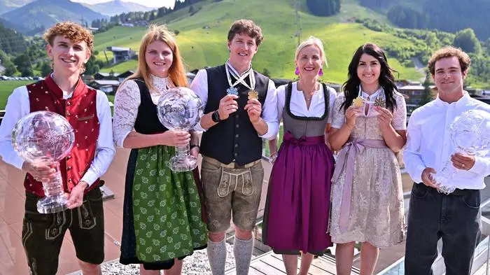 Im Vordergrund stand aber an diesem Abend ohnehin das Feiern, und dafür waren alle ÖSV-Stars nach Hinterglemm gekommen – und das in Tracht. „Mit dem Gewinn der Goldmedaille im Super-G ist für mich ein Kindheitstraum wahr geworden. Nun eine Auszeichnung am Ort meines Erfolgs zu erhalten, ist etwas ganz Besonderes, worüber ich mich sehr freue“, meinte Stephanie Venier im Dirndl. Skispringer Daniel Tschofenig taugte vor allem die Gelegenheit, „sich mit Athleten aus anderen Disziplinen auszutauschen“. Und Raphael Haaser, bei der WM die größte Überraschung, meinte: „Ich blicke auf eine richtig starke und erfolgreiche Saison zurück – umso schöner ist es, hier in Saalbach, wo ich meinen bisher größten Erfolg feiern durfte, auch noch mit einer besonderen Auszeichnung geehrt zu werden.“ Auch Matej Svancer, der als erster österreichischer Freeskier eine große Kristallkugel gewann, wurde in seiner Heimat Salzburg gefeiert: „Das ist mega. Diese Auszeichnung bedeutet mir sehr viel und ist auch eine Anerkennung für die harte Arbeit des gesamten Freeski-Teams.“ Neben den Top-Athleten wurden auch zahlreiche Funktionäre geehrt, Bartl Gensbichler, das „Gesicht“ der Saalbacher WM, erhielt gar das selten vergebene Diamantene Ehrenzeichen des ÖSV. Und natürlich wurden auch alle Sportler, die zurückgetreten sind, noch einmal verabschiedet.