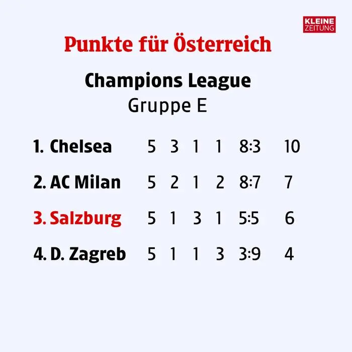 Für Österreichs Serienmeister war es die erste Heim-Niederlage auf internationalem Parkett seit 18. Februar 2021, als Villarreal (2:0) auf Salzburger Boden siegte. Der Aufstieg in Gruppe E ist für das Team von Matthias Jaissle aber weiter möglich. Auswärts wartet im Mailänder San Siro zum Abschluss am kommenden Mittwoch Milan. Italiens Champion gewann bei Dinamo Zagreb dank Toren von Matteo Gabbia (39.), Rafael Leao (49.) und Olivier Giroud (59./Elfmeter) sowie eines Eigentores von Robert Ljubicic (69.) deutlich mit 4:0 (1:0) und schob sich damit um einen Zähler an Salzburg vorbei auf den zweiten Platz. Dinamo ist zum Abschluss in London im Einsatz. Wird Salzburg am Ende Gruppen-Dritter, überwintert man immerhin in der Europa League.