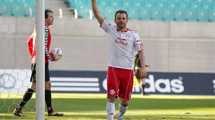 Einstand nach Maß für Roman Wallner: Der Stürmer traf in seinem ersten Pflichtspiel für Red Bull Leipzig gleich drei Mal. Die "Bullen" liegen in der Tabelle einen Punkt vor Holstein Kiel.