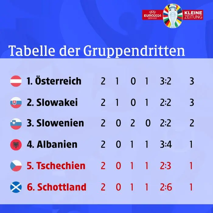 Die Rangliste der Gruppendritten nach zwei von drei gespielten Runden in der EM-Gruppenphase: