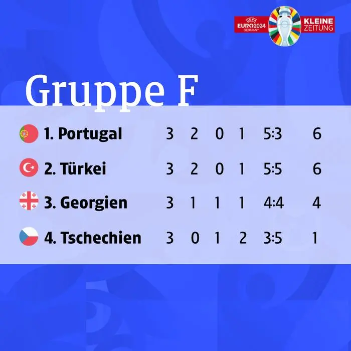 Georgien hat seine EM-Premiere mit einem 2:0-Sieg über Portugal verlängert. Der Weltranglisten-74. zog nach dem überraschenden Sieg am Mittwoch als Gruppendritter hinter Portugal und Türkei ins Achtelfinale ein. Napoli-Star Khvicha Kvaratskhelia (2.) und Georges Mikautadze (57./Elfmeter) schenkten Georgien mit ihren Toren ein K.o.-Duell mit Spanien. Portugals B-Elf blieb trotz aller Dominanz ohne Durchschlagskraft. Cristiano Ronaldo und Kollegen treffen nun auf Slowenien.
