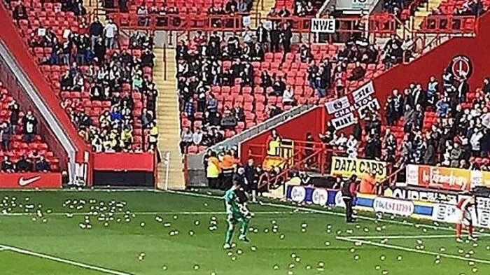 Weil sie mit ihren Klubbesitzern unzufrieden sind, warfen Anhänger von Charlton Athletic und Coventry City Tausende Spielzeugschweinchen auf das Feld.