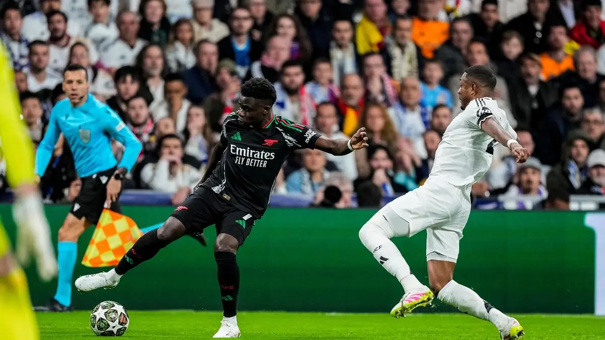 Bei einem Eckball hatte Raul Asencio Arsenals Mikel Merino niedergerungen. Nach Intervention des Video-Assistenten (VAR) und Begutachtung der Bilder entschied Schiedsrichter Francois Letexier auf Strafstoß. Saka scheiterte mit einem zu lässig geschossenen Versuch an Real-Goalie Thibaut Courtois (13.). Auf der Gegenseite ging Kylian Mbappe von Hinspiel-Doppeltorschütze Declan Rice bedrängt zu Boden. Letexier nahm den Elfmeter aber nach Video-Studium zurück (29.).