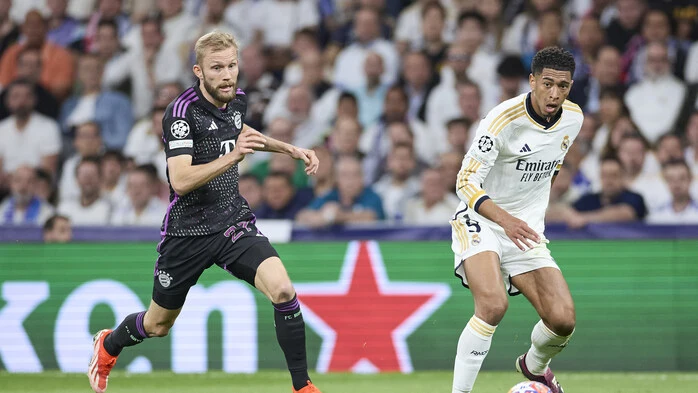 Konrad Laimer (links) muss mit Bayern bei Real Madrid und Jude Bellingham bestehen