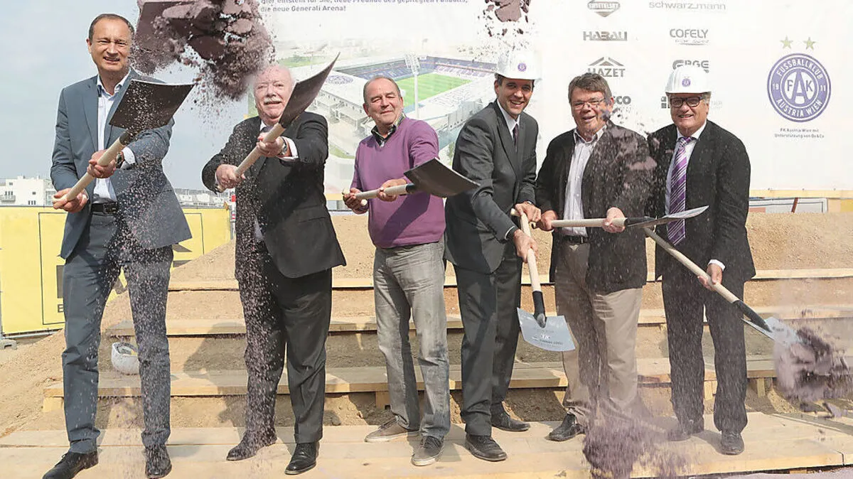 Veilchen-Feier in Favoriten: Die Wiener Austria hat am Montag den offiziellen Spatenstich für die Generali-Arena begangen. Die künftige Heimat der Violetten wird in den kommenden zwei Jahren fast gänzlich neu errichtet und zu einem Vier-Sterne-Stadion nach UEFA-Kriterien aufgemotzt. Die Eröffnung soll im Juli 2018 erfolgen.