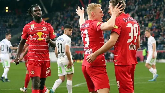 Auf der Gegenseite vergab Adamu einen Volley nach Flanke von Kapitän Andreas Ulmer (16.), ein sehenswerter Treffer von Adeyemi zählte wegen Abseits nach VAR-Studium nicht. Der deutsche Teamspieler war bei der Ballabgabe von Brenden Aaronson mit der Schuhspitze vorne (26.). Adeyemi köpfelte zudem eine Freistoßflanke von Sucic knapp am langen Eck vorbei (40.), die Statistik wies vor der Pause jedoch 4:1 Schüsse aufs Tor für Sturm aus.