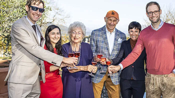Ganz in Familie: Mertel mit Ehefrau Ulrike, Schwester Ilse, den Söhnen Max (mit Freundin) und Martin