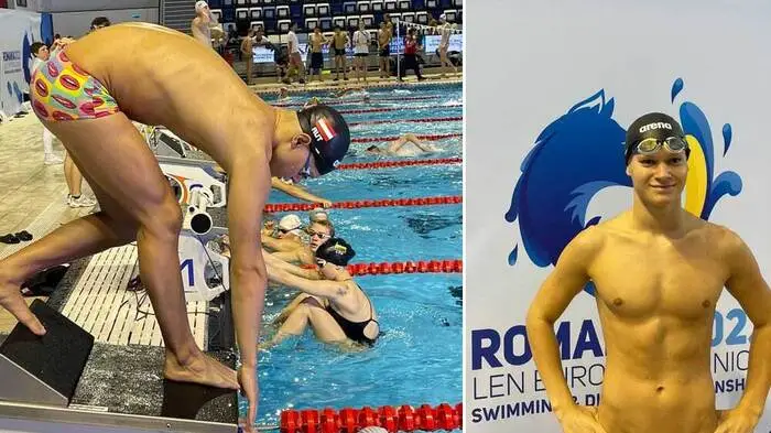 Der Feldkirchner Mark Horvath ließ bei der Junioren-EM in Rumänien sein großes Potenzial aufblitzen. Ein Hingucker: seine Kussmund-Badehose