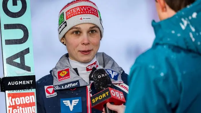 Skispringerin Lisa Eder im ORF-Interview – nur die Trinkflasche fehlt
