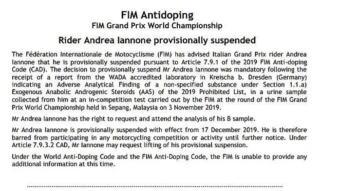 Die Probe hat Iannone am 3. November 2019 beim GP von Malaysia abgegeben. Die WADA untersuchte die Urinprobe ab in einem Dopinglabor und entdeckte dabei verbotene Substanzen, in erster Linie Nandrolon, das der Gruppe der synthetischen Anabol-androgene Steroide angehört.