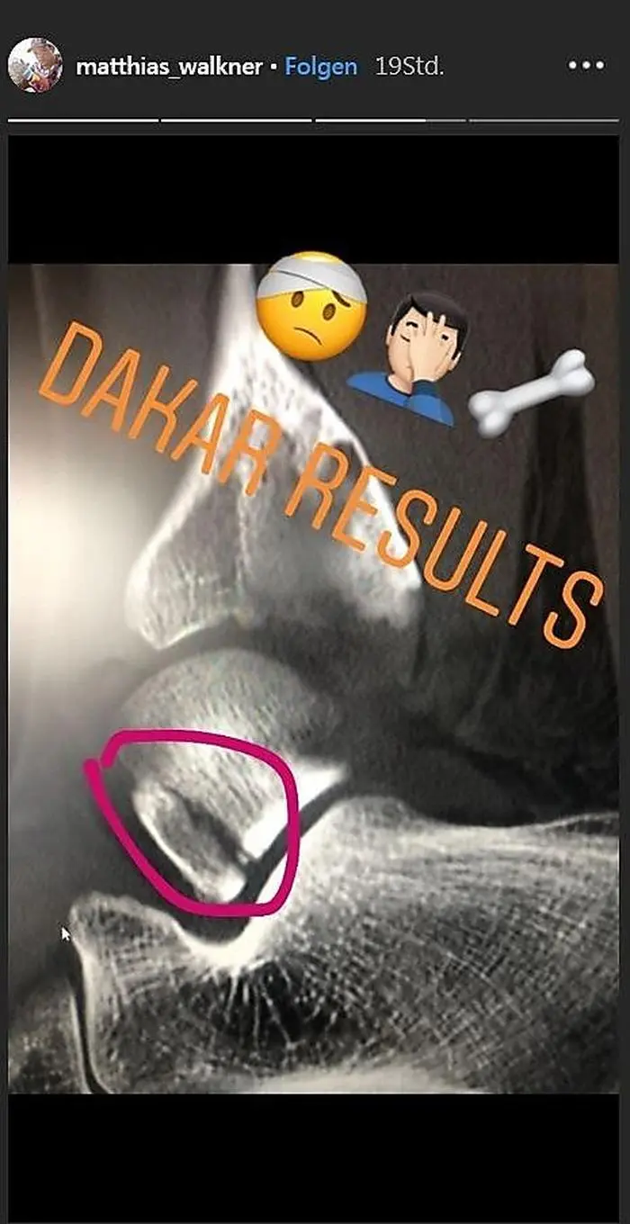 In Österreich wieder angekommen, unterzog sich Walkner zuletzt mehreren Untersuchungen. Konsultiert wurde danach Christian Hoser, der einen sofortigen Eingriff in der Privatklinik Hochrum empfahl. Walkners Physiotherapeut David Denifl erklärte dazu: "Zwar ist es ein Routinebruch, aber er wurde 14 Tage lang nicht versorgt und der Fuß wurde voll belastet. Ich hoffe, der dadurch entstandene Schaden hält sich im Rahmen. Es ist unvorstellbar, dass Matthias mit diesen Schmerzen noch weitergefahren ist."