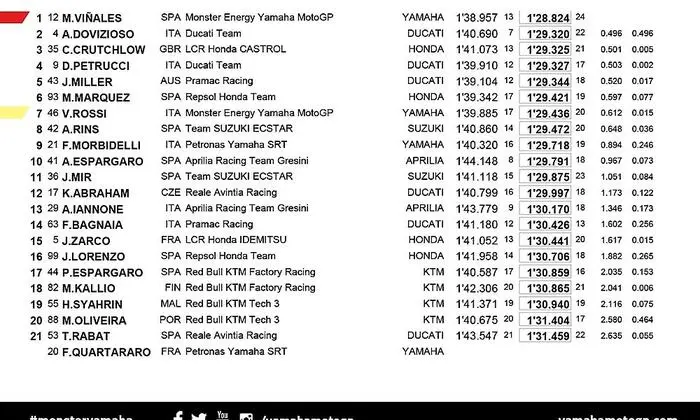 So fragt die Branche natürlich: hat Rossi den zeitgerechten Absprung verpasst, hat er mittlerweile auch so viel Speed eingebüßt, dass er gegen die jungen Heißsporne keine Chance mehr hat. Er fährt seinem Teamkollegen Maverick Vinales hinterher und nun läuft ihm sogar noch Fabio Quartararo in der Kunden-Yamaha von Tech3 den Rang ab.