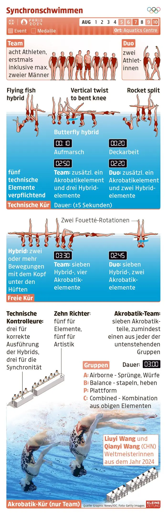 Die in Griechenland geborenen Schwestern haben alles dem Sport untergeordnet. „Wir haben viel geopfert. Jetzt ist die Zeit, zu zeigen, woran wir gearbeitet haben. Es ist eine Ehre für uns, dass wir das für Österreich machen dürfen“, sagt Anna-Maria. Sie wissen, dass sie vom Niveau her „vielleicht mit China“ auf einer Stufe stehen und damit über allen anderen, eventuell Kanada könne noch mit. Sie wissen aber auch, dass gerade im Synchronschwimmen viel von den Kampfrichtern abhängt. Und die können wankelmütig sein. „Es gibt oft Proteste und Gegenproteste.“ Sie wissen auch, dass die Konkurrenz für Olympia noch einmal nachlegen wird, auch sie haben das in ihrer Kür, die zu den Klängen von „We Will Rock You“ startet und dann einen Condor einfließen lässt. Mehr verraten sie nicht. „Wir schauen uns auch nicht an, welche Schwierigkeitsgrade die anderen haben werden, das haben wir uns versprochen, wir googeln auch nicht“, schmunzelt Eirini.