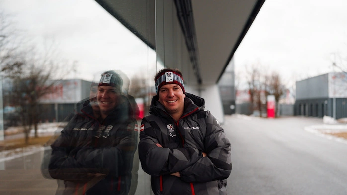 Der österreichische Para-Skiathlet Markus Salcher lehnt an einer Glaswand