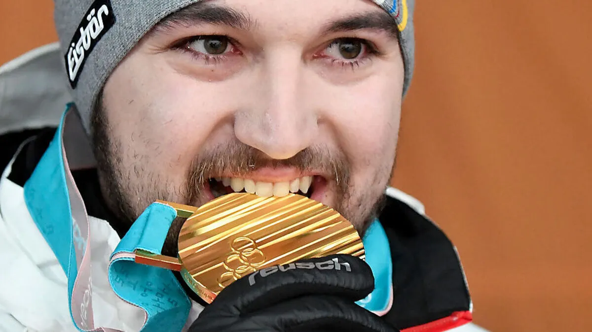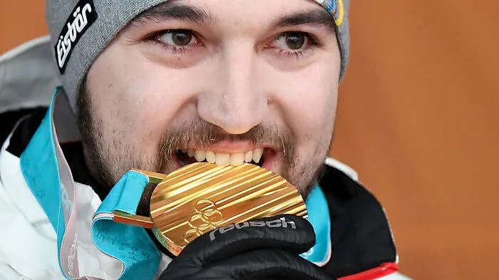 Rodel-Olympiasieger David Gleirscher erhielt feierlich seine Goldmedaille.