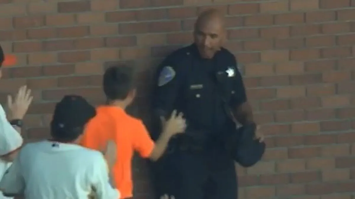 Während eines Baseballspiels fängt ein amerikanischer Cop den Ball mit seiner Mütze und schenkt ihn gleich einem Kind weiter.