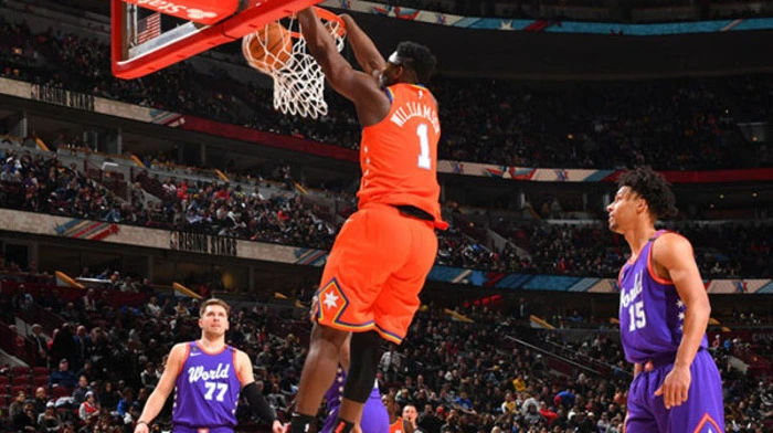 Zion Williamson sorgte bei der Rising Stars Challenge für Spektakel - allerdings auch für ein Kuriosum: Bei einem beidhändigen Dunk kurz vor der Halbzeitpause verbog der Nr.1-Pick die Korbanlage.
