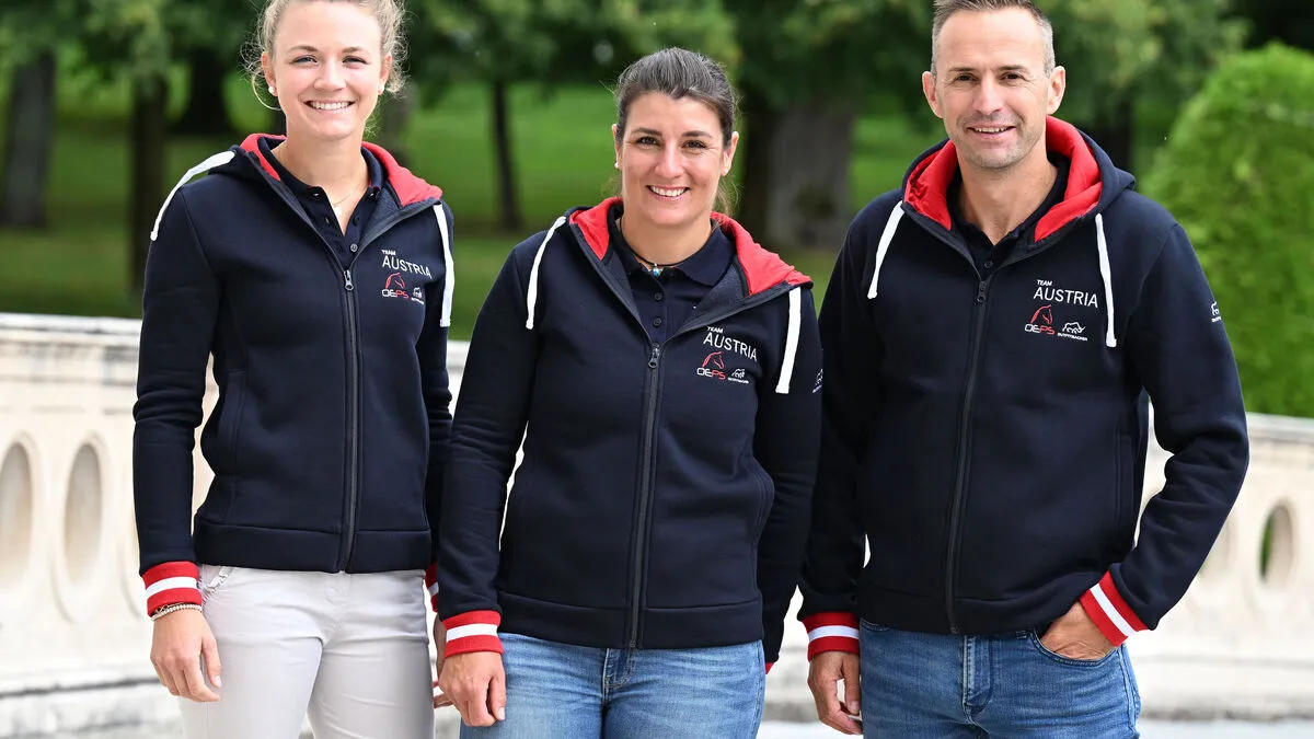 Österreichs Vielseitigkeits-Team in Frankreich: Lea Siegl, Kathrin Khoddam-Hazrati, Daniel Dunst (von links)