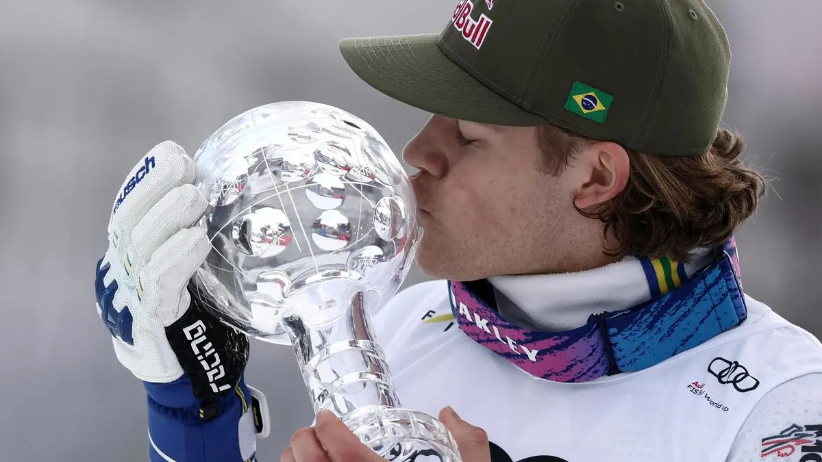 Lucas Pinheiro Braathen küsst die kleine Kristallkugel für den Sieg im RTL-Weltcup – erstmals für Brasilien