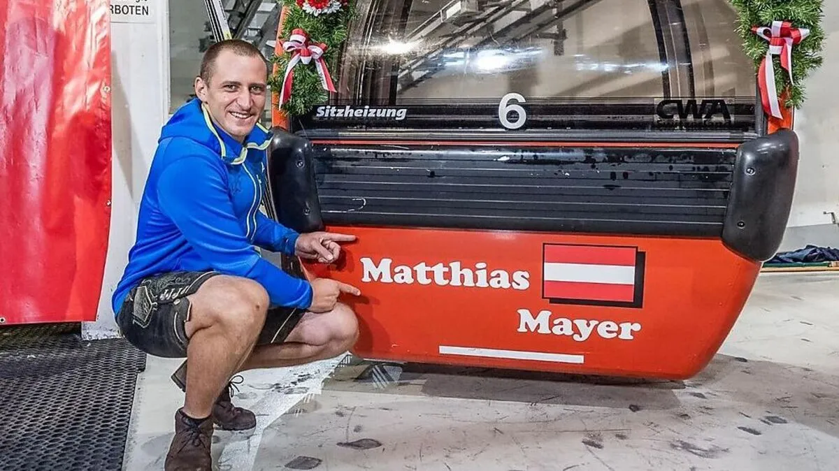 Matthias Mayer nahm auf dem Hahnenkamm die um den Erfolg in der Abfahrt ergänzte Gondel seines Namens in Empfang - da störte selbst strömender Regen nicht.
