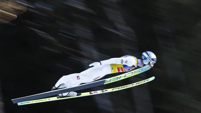 236,5 Meter flog Johannes Lamparter bei der Weltpremiere auf einer Flugschanze. Die 7,5 Kilometer Langlauf folgen um 16 Uhr.