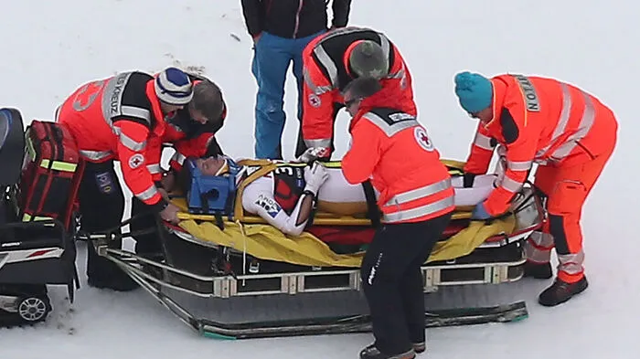 Der österreichische Skispringer Gregor Schlierenzauer wird nach seinem schweren Sturz der Qualifikation ärztlich versorgt und auf einer Trage aus dem Stadion gefahren