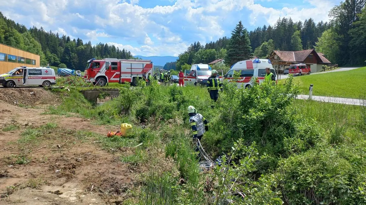 Der junge Motorradfahrer verletzte sich bei dem Unfall schwer. Nach der Erstversorgung durch das Rote Kreuz wurde der 25-Jährige mit dem Rettungshubschrauber C 12 ins LKH-Uniklikum Graz geflogen. Die Feuerwehr Wies unterstützte die Rettung und barg das Motorrad mit einer Seilwinde aus dem Bach. Zwölf Kräfte waren rund eineinhalb Stunden im Einsatz.
