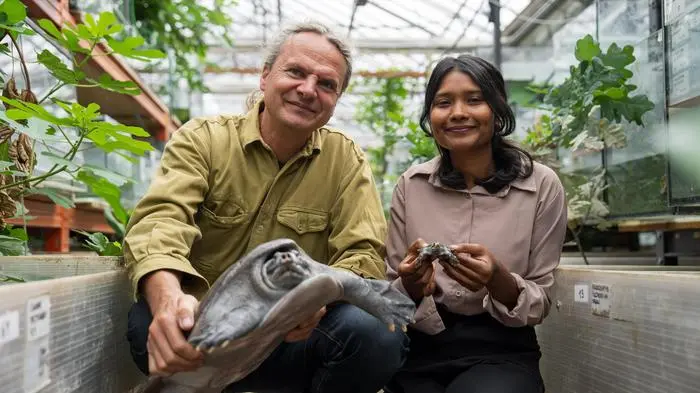 Peter Praschag (Turtle Island) und die nepalesische Biologin Asmita Ranapaheli mit einem Eltern- und einem Jungtier der stark gefährdeten Pfauenaugen-Weichschildkröte