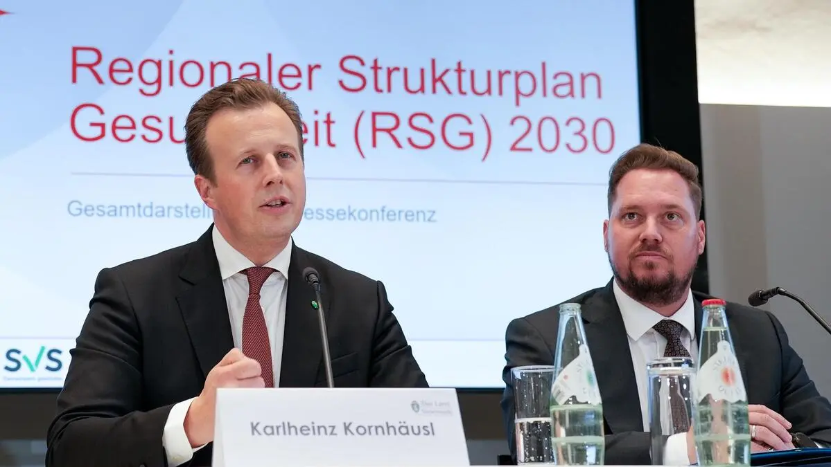Gesundheitslandesrat Karlheinz Kornhäusl mit ÖGK-Beatrice Erker und FPÖ-Klubobmann Marco Triller bei der Vorstellung des RSG 2030