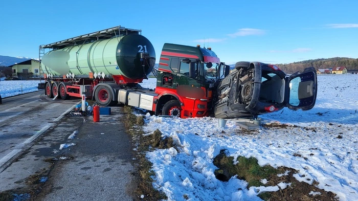 Bei einem schweren Unfall in St. Martin im Sulmtal wurde eine hochschwangere Pkw-Lenkerin (42) verletzt, insgesamt mussten drei Menschen ins Krankenhaus gebracht werden. Gefahrguttransporter war nicht beladen.