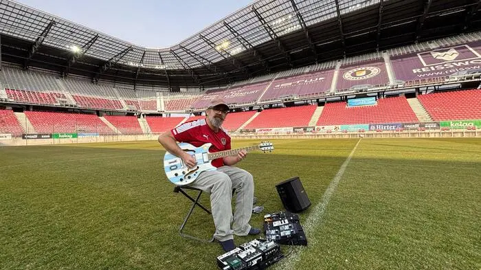 Spielte der gebürtige Deutschlandsberger bisher von der Pampa bis zum Ozean stets in einsamer Wildnis, will er nun seine Solo-Auftritte in sonst von Massen frequentierten Orten in absoluter Einsamkeit absolvieren. Ein Mann, seine Gitarre im Trikot-Design seines Helden Diego Maradona, ein Board mit Effektpedalen, ein kleiner Verstärker, zwei Kameras und eine Drohne, alles im Akkubetrieb: So sitzt Schimpl Anfang der Woche im Mittelkreis des Wörthersee-Stadions – vor leeren Rängen. Es ist der Auftakt seiner neuen Tournee.