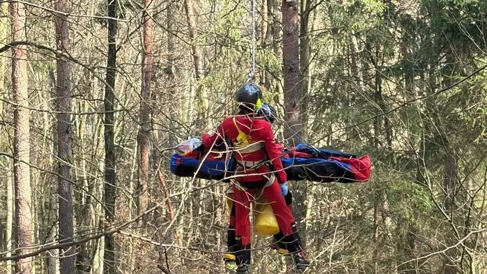 Nach seinen eigenen Angaben war er von einem Teil eines Baumes wie durch einen Peitschenschlag am Unterschenkel getroffen worden, wodurch er schwere Beinverletzungen erlitt. Zu seinem Glück konnte der 53-Jährige noch mit dem Handy den Notruf wählen. Ein Team des Roten Kreuzes und eine Notärztin führten die Erstversorgung durch. Weil sich das alles in unwegsamen Gelände abspielte, entschied man sich für eine Seilbergung mit dem Notarzthubschrauber C 12