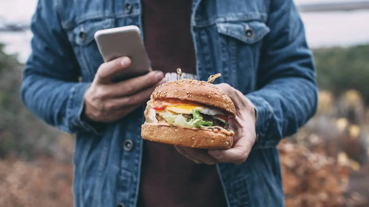 Das Bild zeigt eine Person, die einen Burger und ein Smartphone in der Hand hält