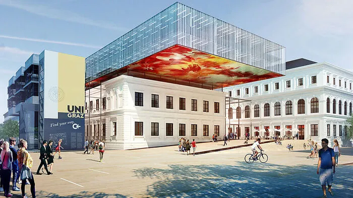 Im Zuge des 28 Millionen Euro teuren Generalumbaus der Bibliothek an der KF-Uni Graz starten heute die Abbrucharbeiten. Der Nordteil wird abgerissen, der Südteil saniert. Wenn die Abrissbirne weg ist, wird noch bis 2019 gebaut.