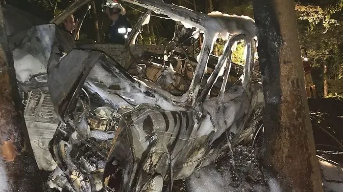 Das Fahrzeug wurde eingekeilt und ging in Flammen auf - vier  Feuerwehren waren im Einsatz
