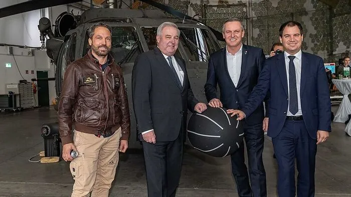 Raimund Riedmann, Hermann Schützenhöfer, Mario Kunasek und Michael Schickhofer vor einem Black Hawk