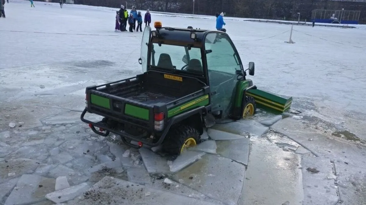 Am Eislaufplatz beim Bad Weihermühle ist am Sonntag ein Traktor im Eis eingebrochen. Die Feuerwehr Gratwein konnte das Fahrzeug aus dem Loch ziehen.