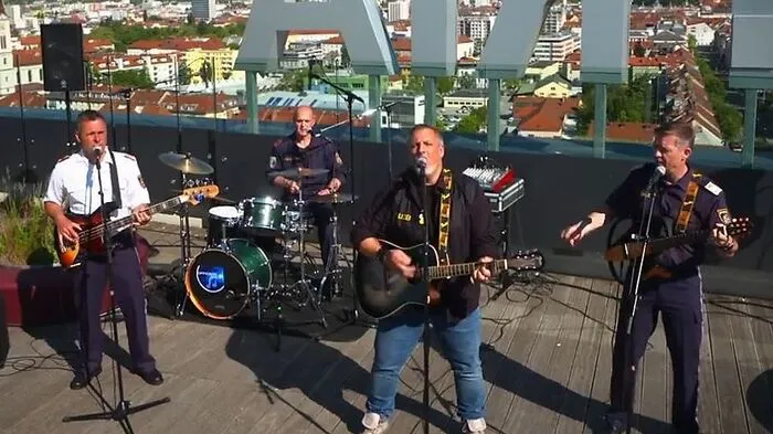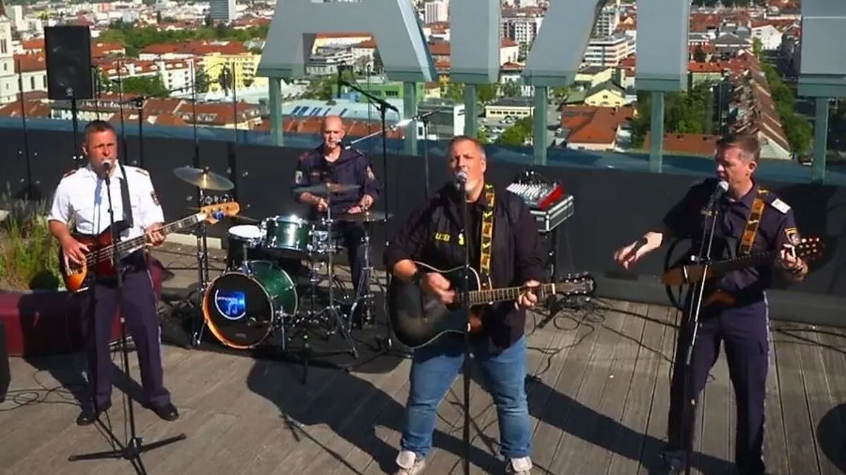 Gert Steinbäckers Hymne wird von steirischen Polizisten intoniert. Das spektakuläre Video dazu wurde auf der Dachterrasse der Styria in Szene gesetzt.