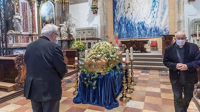Schwarze Fahnen vor dem Grazer Dom, eine Menschenschlange mit reichlich Abstand zwischen den Trauerenden, ein Einbahnsystem ins und aus dem Gotteshaus und Desinfektionsspender an jeder Ecke. Ein Kreuzzeichen beim Eintreten, ohne Weihwasser, dafür mit etwas Hygienemittel.