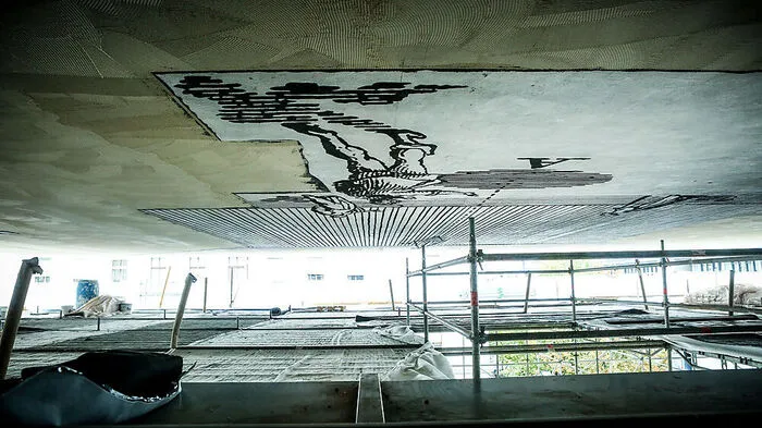 Derzeit wird an der Auskragung der Bibliothek der Uni Graz ein überdimensionales Kunstprojekt umgesetzt.