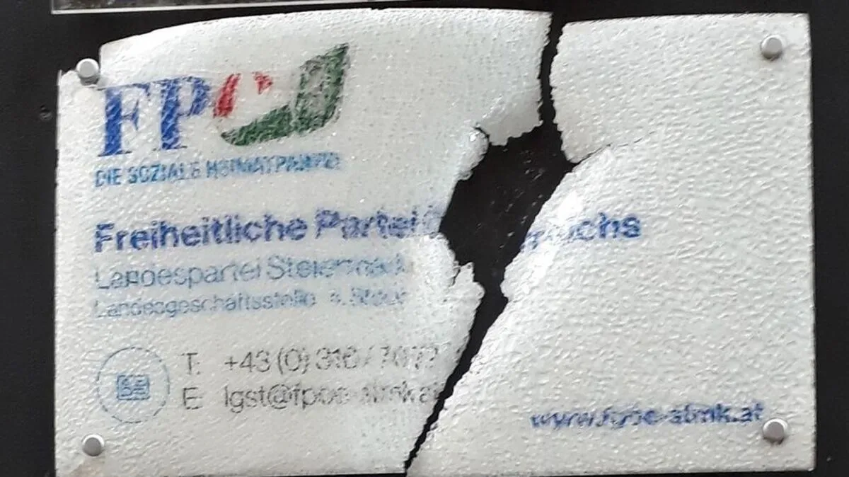 Hinweisschild an der Parteizentrale der steirischen FPÖ wurde von Unbekannten eingeschlagen und mit Stickern versehen. Partei brachte Anzeigen ein und tobt über "Anschlag auf die Demokratie".