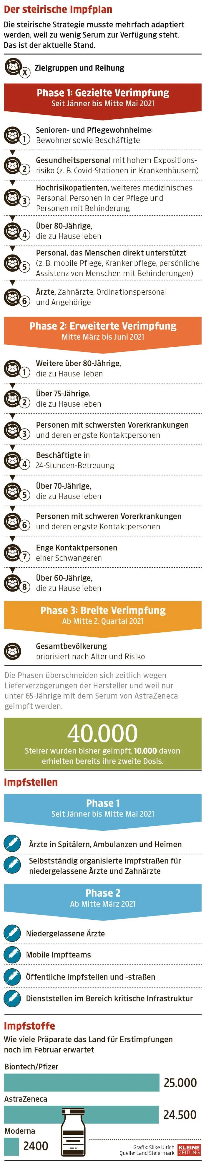 Die Steiermark hat bisher etwa 40.000 Personen geimpft, für mehr als 50.000 weitere wird die erste Impfdosis noch im Februar erwartet. Doch nach welcher Reihenfolge geht das Land nun tatsächlich vor? Und wann kommt wer an die Reihe? Ein grafischer Aufklärungsversuch.